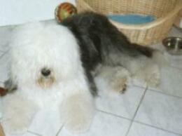 Bobtail "Jonny" wartet in aller Ruhe auf sein Frauchen.
